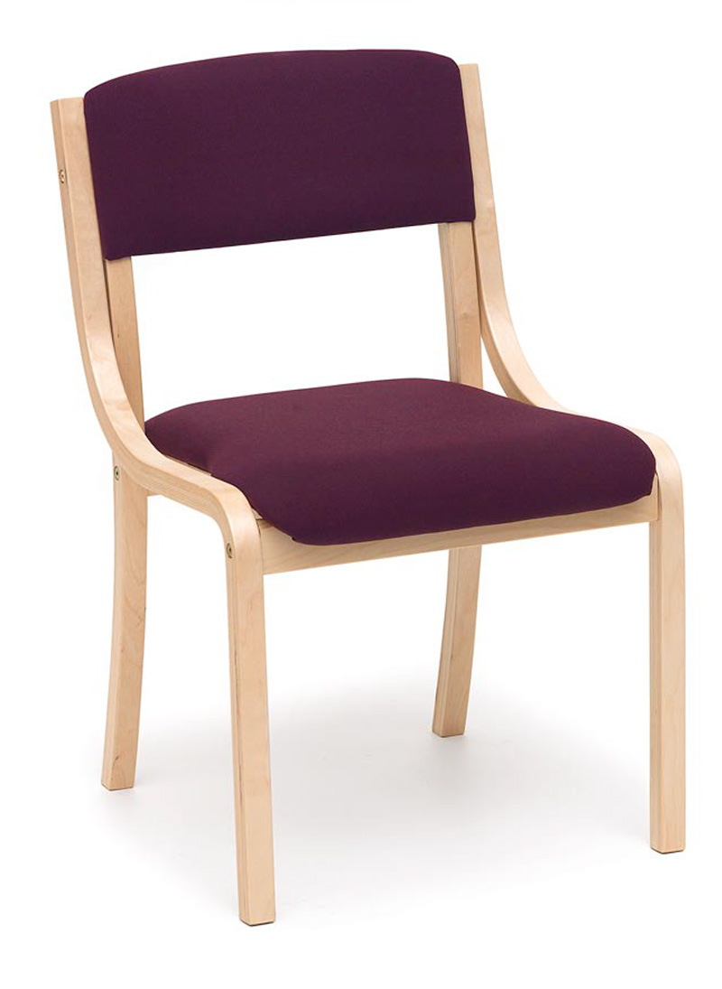 Stativ av skiktlimmad bok alt. björk. Sits och rygg klädd ex. tyg. Stoppning av kallskum, 20 mm alt 30 mm mot tillägg. Kan förses med skrivskiva. Kan även förses med hjul på framben. Stapel- och kopplingsbar. Ekfanér offereras.